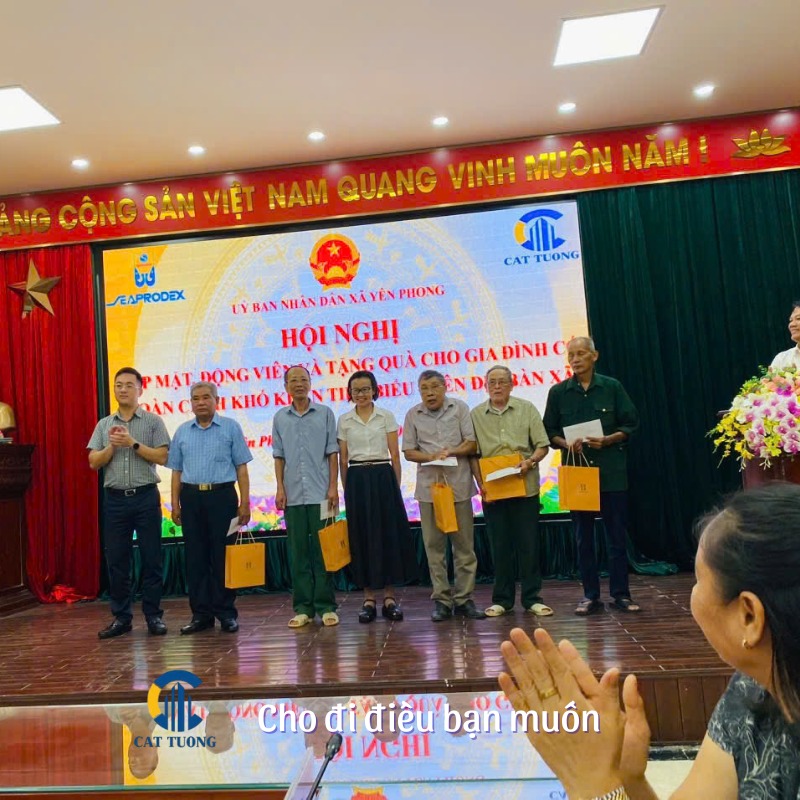 Sáng ngày 02/10/2025, Cát Tường đã có mặt tại hội trường UBND xã Yên Phong đã diễn ra Hội nghị gặp mặt, động viên và tặng quà cho các gia đình có hoàn cảnh khó khăn tiêu biểu trên địa bàn xã. Chương trình được tổ chức trang trọng với sự tham dự của lãnh đạo UBND xã, các ban ngành đoàn thể, đại diện Công ty Cổ phần Cát Tường, Công ty Cổ phần Thủy sản Khu vực I, cùng đại diện các thôn, khu phố và các hộ gia đình có hoàn cảnh khó khăn.