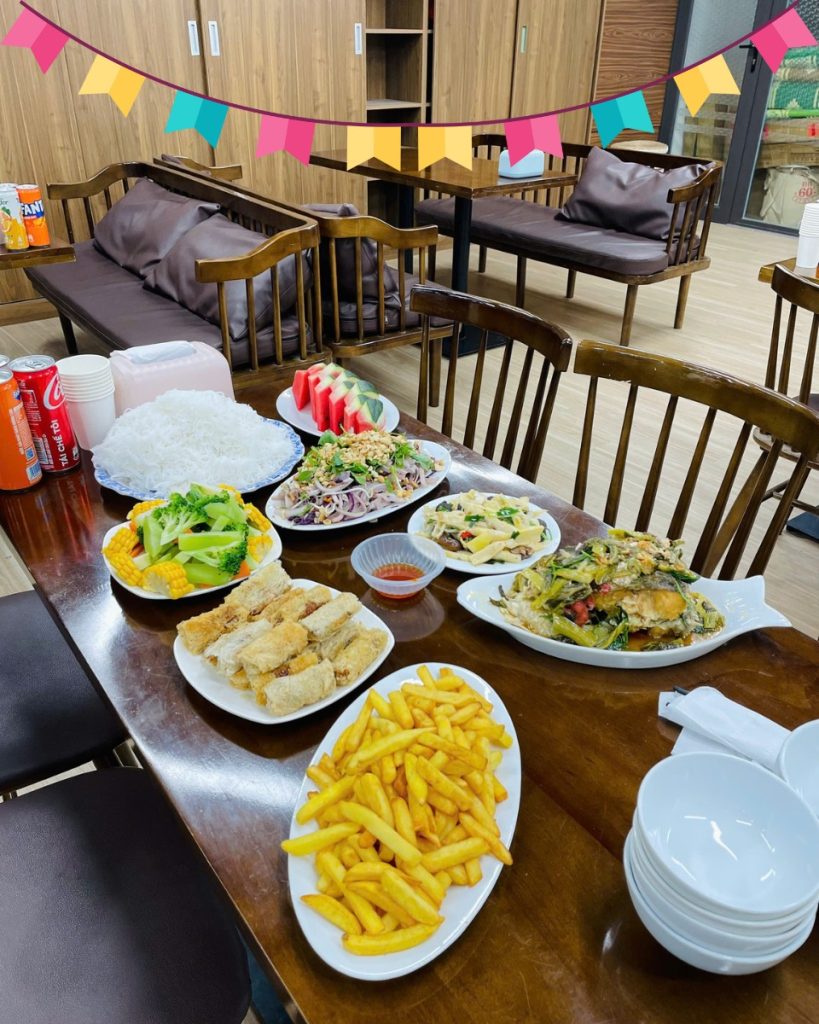 Không chỉ dừng lại ở đó, bữa tiệc còn trở nên sôi động hơn với những cuộc trò chuyện rôm rả, những tiếng cười giòn tan khi mọi người cùng nhau thưởng thức bữa ăn thân mật được chuẩn bị kỹ lưỡng. Từ món chiên giòn hấp dẫn đến salad thanh mát hay những ly nước ngọt mát lạnh, tất cả hòa quyện tạo nên một không gian đậm chất “Cát Tường” – vừa chuyên nghiệp, vừa gần gũi.