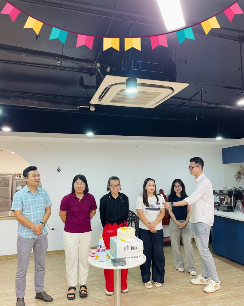 Ngay từ những phút đầu, nụ cười rạng rỡ, ánh mắt háo hức của mọi người đã khiến không gian ngập tràn năng lượng tích cực. Chiếc bánh kem xinh xắn phủ đầy những miếng xoài vàng tươi – như biểu tượng cho sự tươi mới, sáng tạo và ngọt ngào trong mỗi hành trình làm việc cùng nhau.