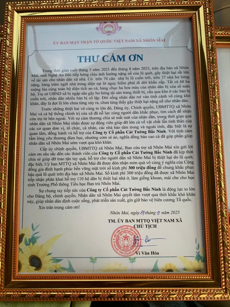 Dù mệt mỏi, nhưng trên môi ai cũng nở nụ cười – nụ cười của niềm hạnh phúc khi được cho đi. Thư cảm ơn hay bằng khen của địa phương trao tặng chính là minh chứng rõ nét nhất cho những ghi nhận của Cát Tường tại nơi đây.