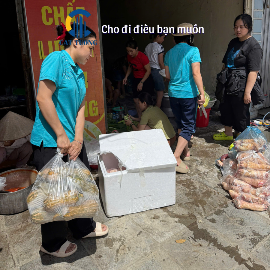 Ít ai biết rằng, để có thể kịp thời trao quà cho bà con trong sáng ngày 8/10, toàn bộ đội ngũ Cát Tường đã thức trắng đêm 7/10 – tất bật phân chia hàng hóa, chuẩn bị từng phần quà, từng suất ăn, kiểm tra lại lộ trình di chuyển qua vùng ngập sâu.