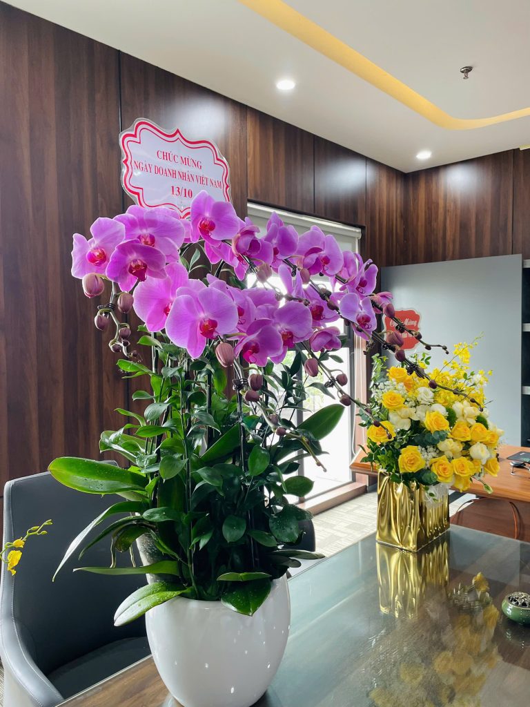 Không gian buổi tiệc được trang trí tinh tế với sắc hoa tươi rực rỡ, bánh ngọt và những món quà ý nghĩa, thể hiện sự chuẩn bị chu đáo và tấm lòng trân trọng của tập thể Cát Tường. Từng chi tiết nhỏ – từ bó hoa lan tím sang trọng đến chiếc bánh ngọt mang dòng chữ “Chúc mừng ngày Doanh nhân Việt Nam 13/10” – đều gửi gắm thông điệp tri ân chân thành tới những người lãnh đạo đã không ngừng nỗ lực dẫn dắt Cát Tường phát triển vững mạnh.