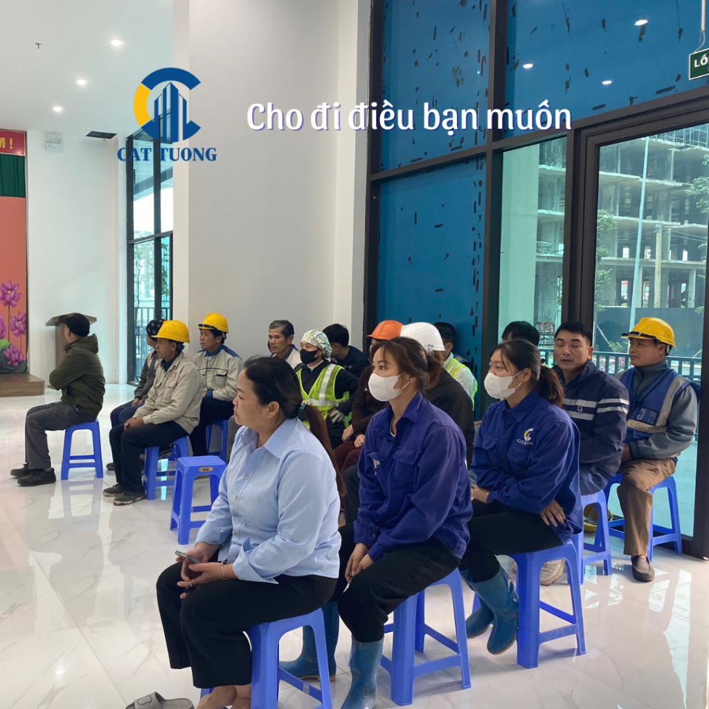 Các hình ảnh cho thấy, dù giữa mùa thi công cao điểm, anh em công nhân vẫn nghiêm túc ngồi lắng nghe, tiếp thu từng nội dung bài giảng. Điều đó phản ánh rõ nét văn hoá trách nhiệm và tinh thần làm việc của đội ngũ Cát Tường – luôn đặt an toàn – chất lượng – kỷ luật làm kim chỉ nam trong mọi hoạt động.