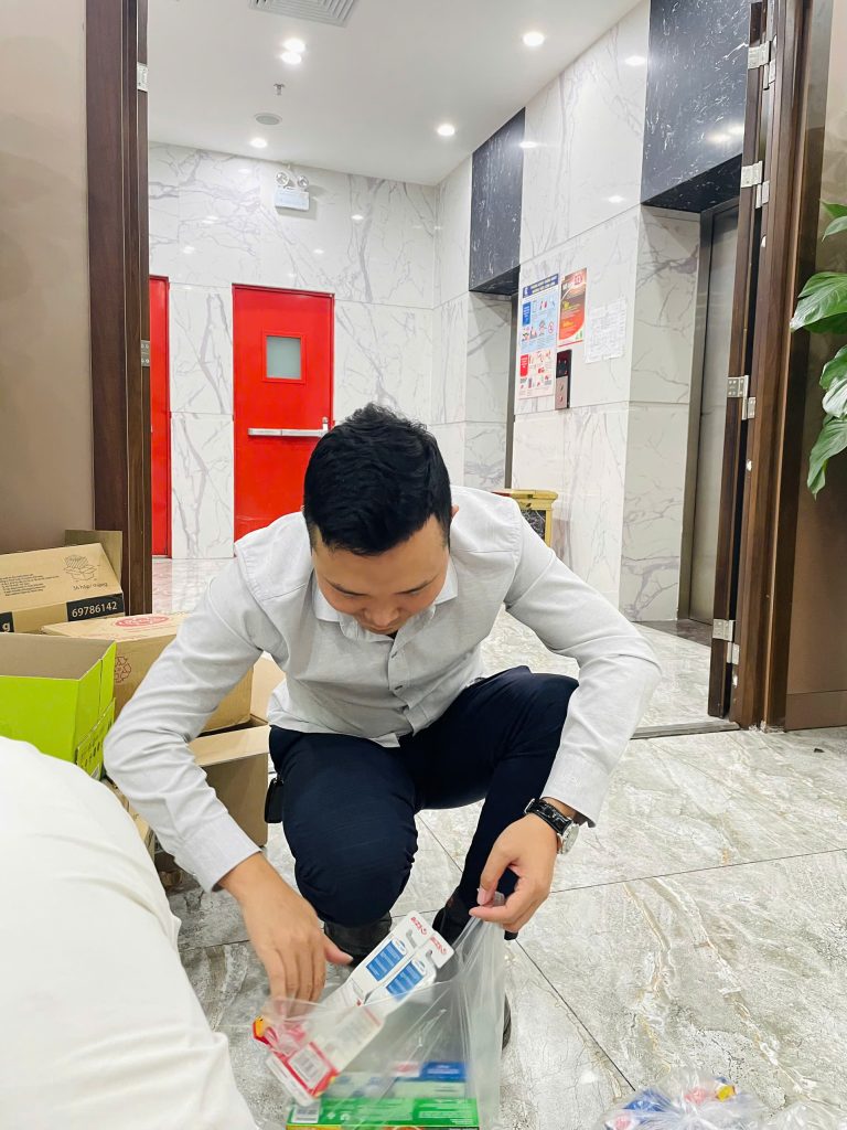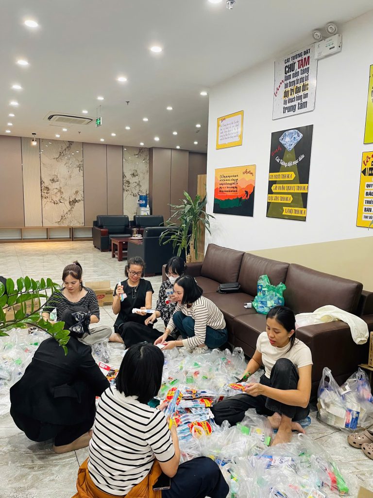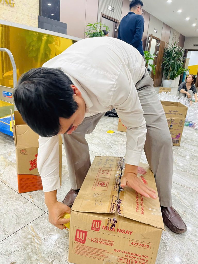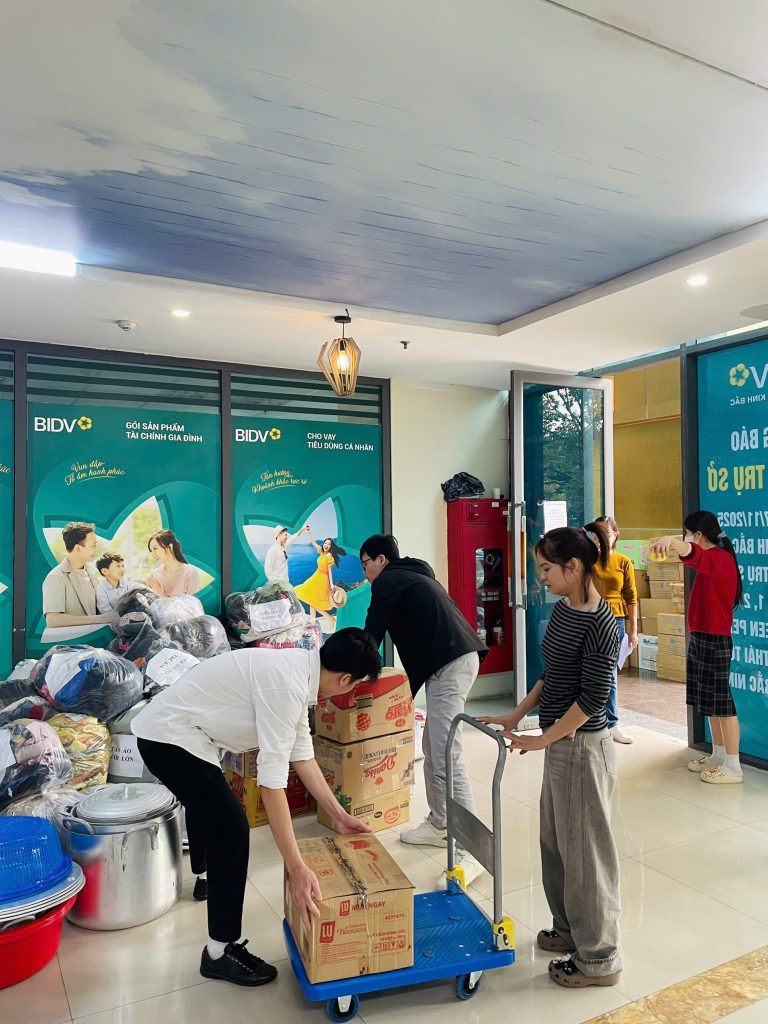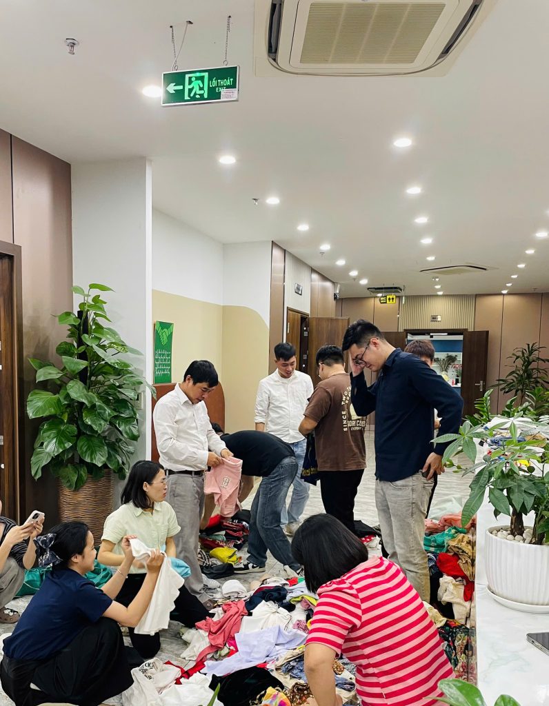 Ngay từ trưa ngày 22/11/2/2025, tại trụ sở Cát Tường, hàng chục cán bộ nhân viên đã tạm gác lại công việc tập trung tại sảnh của tòa nhà chung tay phân loại và đóng gói hàng hóa cứu trợ quần áo nhận từ các nơi gửi về. Không khí khẩn trương nhưng đầy ấm áp lan tỏa khắp khu vực sảnh.